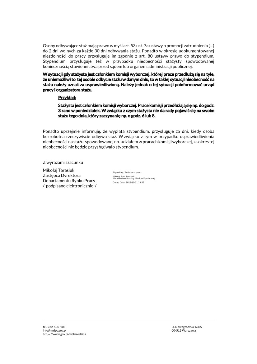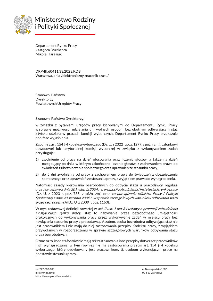 Pismo Departamentu Rynku Pracy MRiPS w sprawie możliwości udzielania dni wolnych osobom bezrobotnym odbywającym staż z tytułu udziału w pracach komisji wyborczych