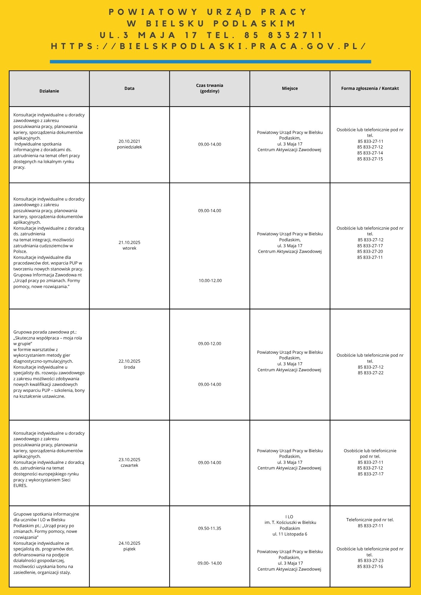 Zapraszamy do zapoznania się z harmonogramem działań OTK 2025. Na niektóre z naszych propozycji obowiązują zapisy. Chętnych do skorzystania zapraszamy do kontaktu: te. 85 74 97 244 lub 241, https://wupbialystok.praca.gov.pl/zapisz-sie-na-spotkanie-warsztaty/